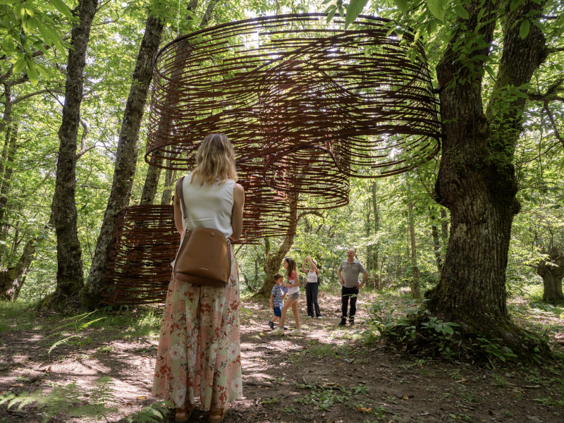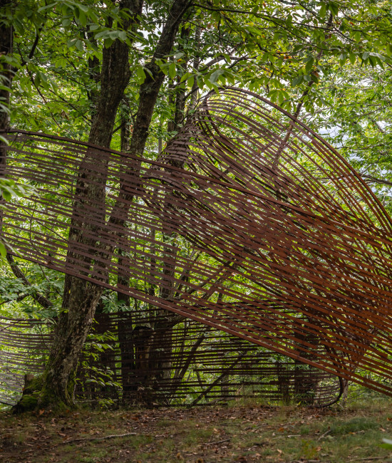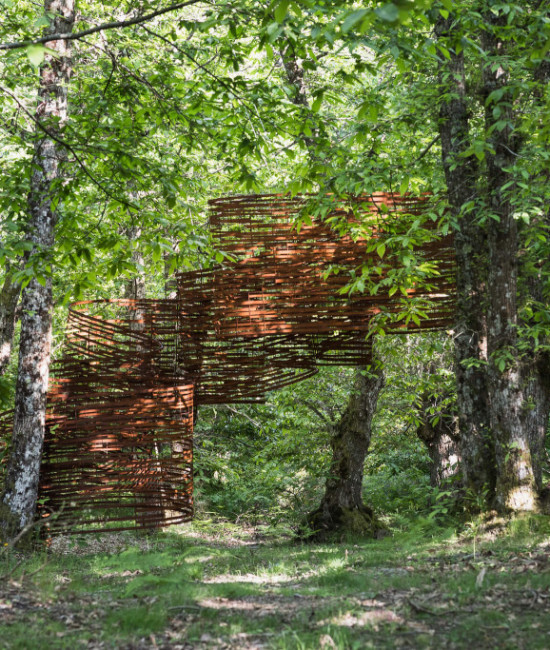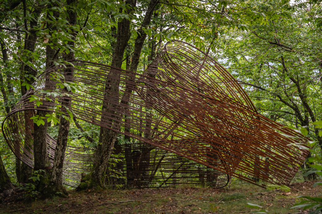 L’installazione dell’architetto giapponese, in acciaio e fibra di carbonio, si avviluppa fra gli alberi in una piccola radura, comparendo all’improvviso e quasi casualmente agli occhi delle persone: la struttura delle tre opere, anche grazie al materiale utilizzato, vibra al vento ed entra in consonanza con la natura circostante, in una relazione rispettosa, minimale, quasi immateriale.