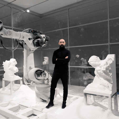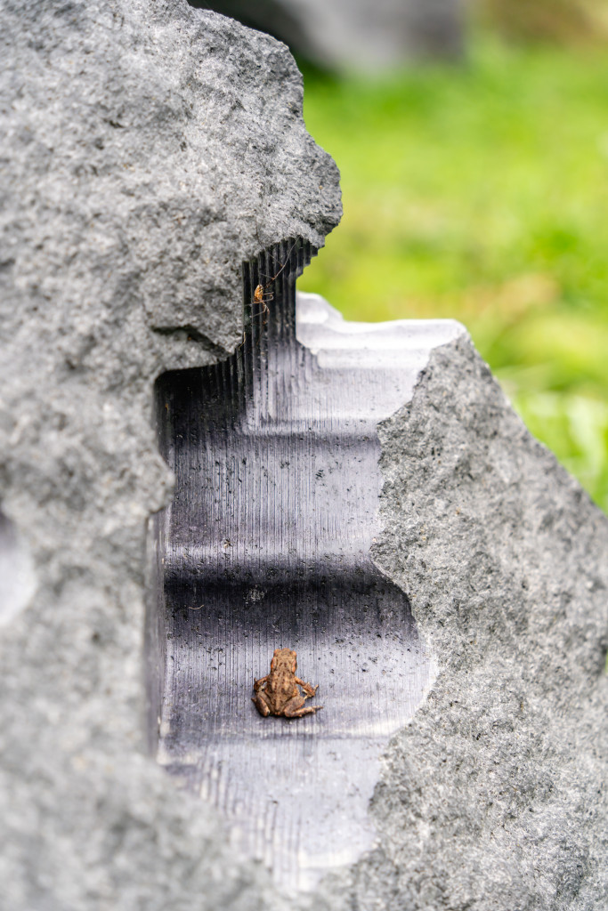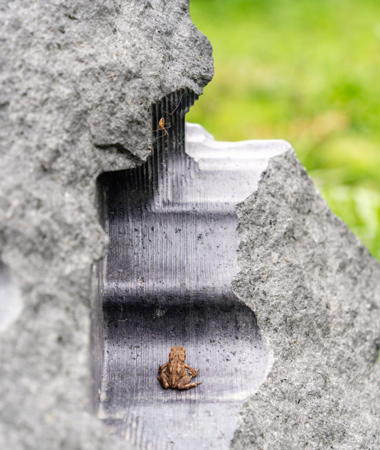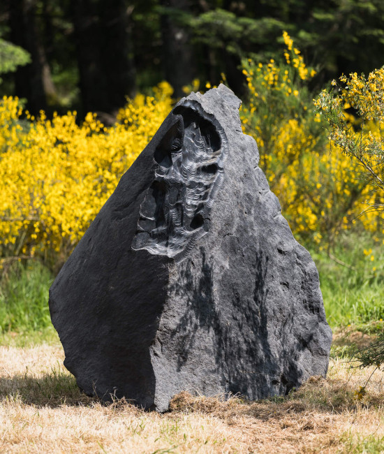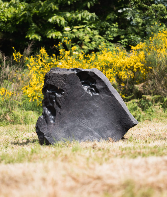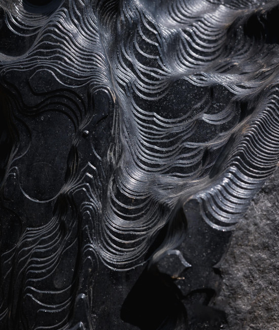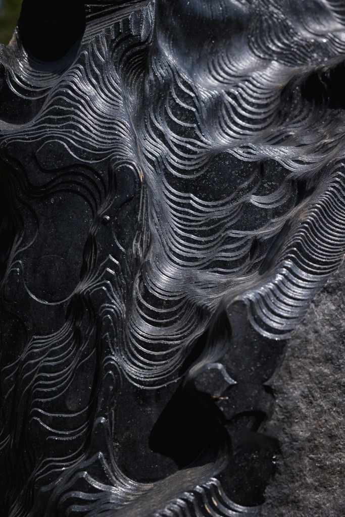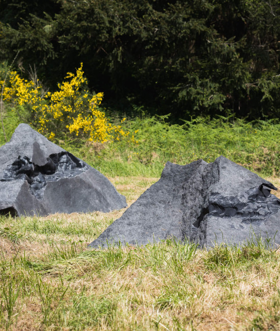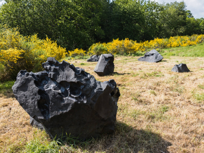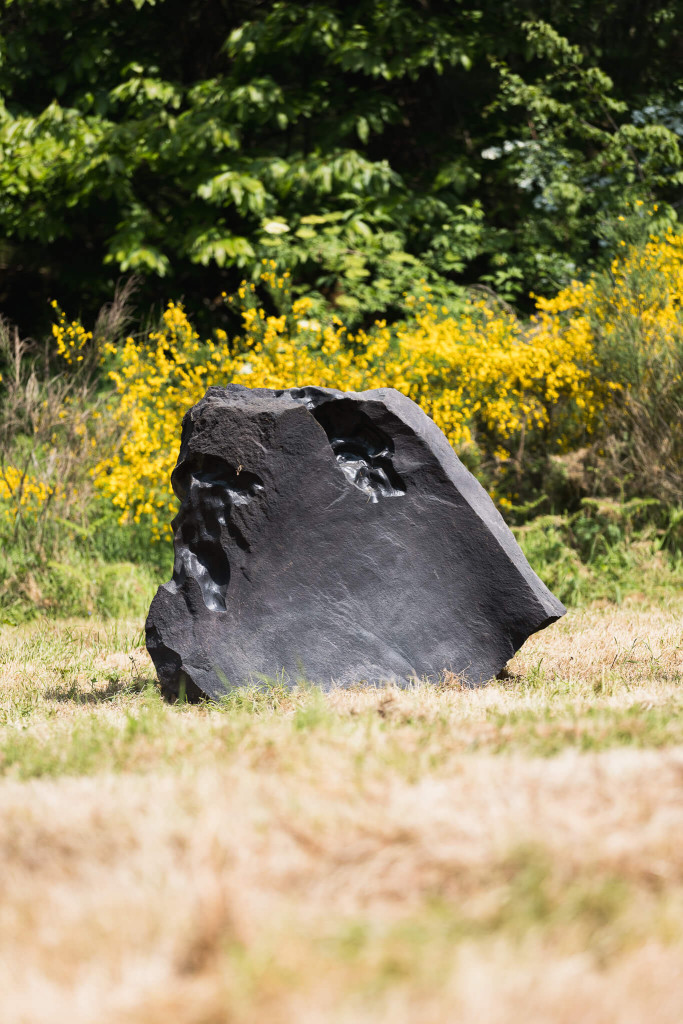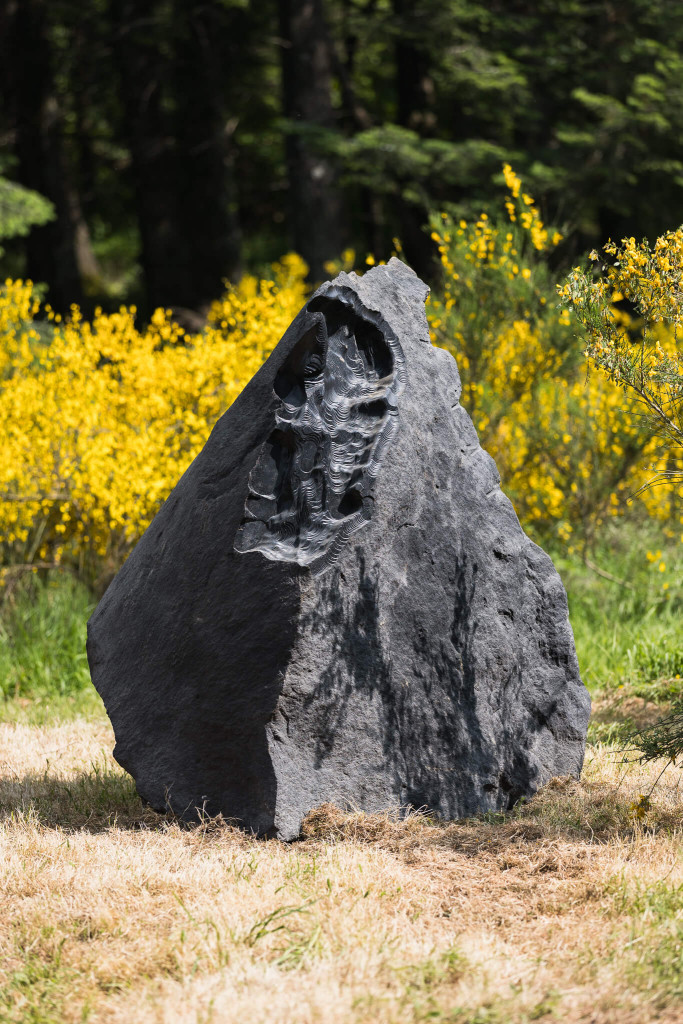 Le stesse civiltà antiche utilizzarono pietre piovute dallo spazio per erigere monumenti sacri. Poco distante dal “recinto” di Thun ci si imbatte in altre strane pietre seminascoste dalla vegetazione, sassi neri simili a meteoriti, disposti casualmente a ridosso del bosco. “Erosions”, l’opera dell’artista italiano Quayola, interviene su pietre laviche con erosioni generate da un algoritmo e lavorate da una speciale macchina.